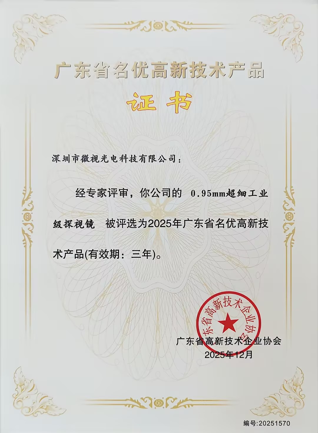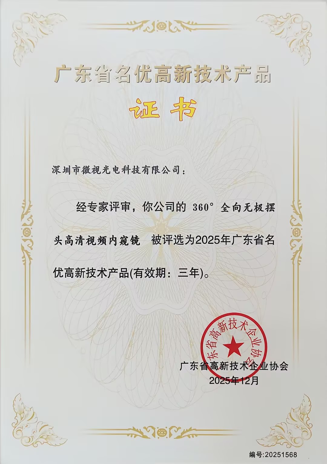 近日,深圳微視三款創(chuàng)新產(chǎn)品:耐高溫智控冷旋內(nèi)窺鏡、0.95mm超細工業(yè)級探視鏡以及360°全向無極擺頭高清視頻內(nèi)窺鏡,均榮獲“2025年廣東省名優(yōu)高新技術(shù)產(chǎn)品”稱號。這一認證不僅是對微視光電技術(shù)實力的高度認可,也標(biāo)志著公司在高新技術(shù)領(lǐng)域的又一重大突破。