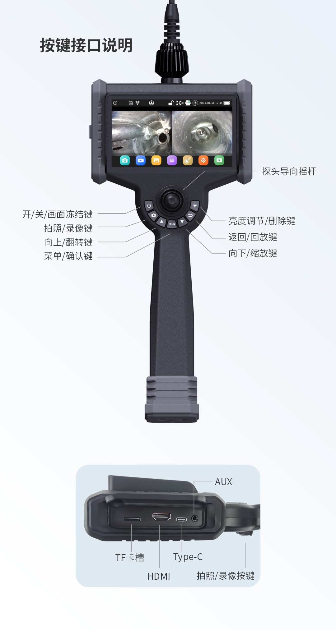 優(yōu)勢(shì)特點(diǎn):6英寸高清觸摸屏、快速更換管線、360°全方向擺頭、后置LED光纖導(dǎo)光、18650電池,工作時(shí)長(zhǎng)≥8