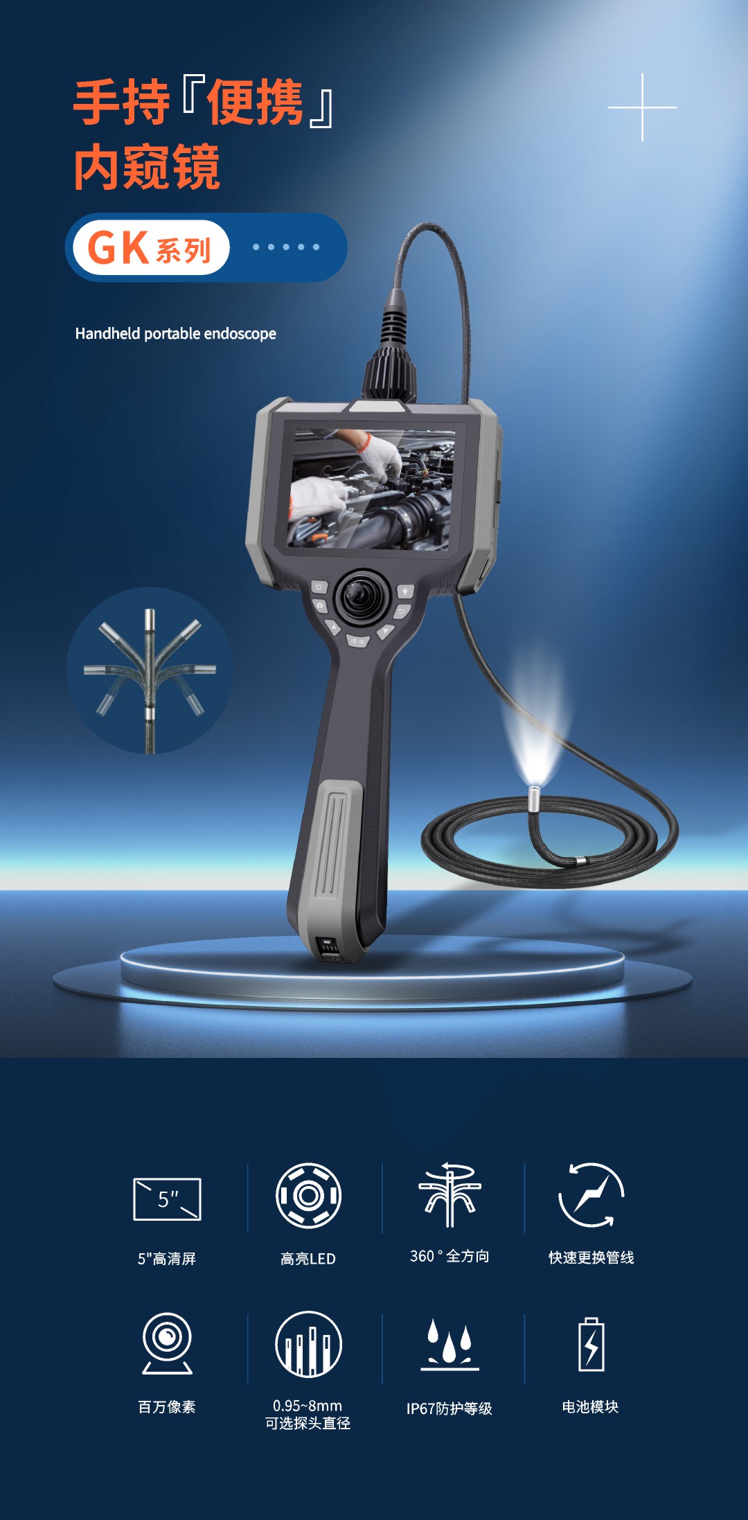 優(yōu)勢特點(diǎn):百萬高清像素,前置高亮燈,快速更換管線,5英寸大屏
